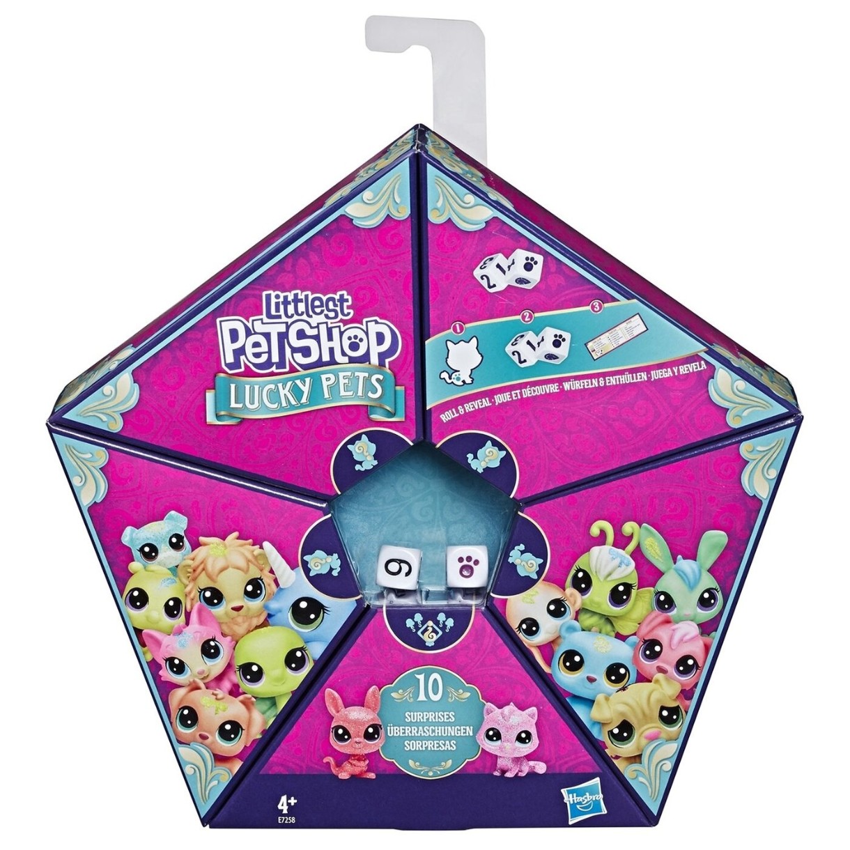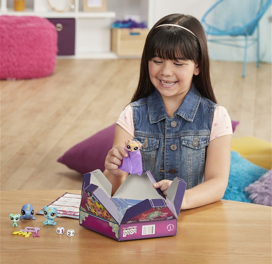 Hasbro LPS "Animăluțe cu predicție” Deschide cutia frumoasă cu pachețele secrete. În interior sunt 4 animăluțe minunate, de dimensiuni clasice, cu detalii excelente, 1 mini-animăluț de companie, 2 blocuri de joc și 4 pandantive cu un cârlig în formă de S, pe care atârnă un accesoriu original, un clip și un ghid de colecție. Încercați-vă norocul cu culoarea animăluțelor și cu numerele desenate de pe cub. Toate denumirile sunt indicate în fișa de colectare. Colecția are peste 150 de animăluțe. Pandantivele pot fi combinate, colectați și creați brățara norocoasă. Conținut: 3 animăluțe de dimensiune clasică, 1 mini-animăluț de companie, 2 cuburi, 4 pandantive de farmec cu cârlige în formă de S, o clemă și o fișă de colecție.