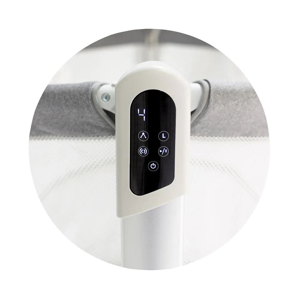 - 12 melodii încorporate și Bluetooth – alegeți cea mai liniștitoare muzică sau un cântec de leagăn de pe telefon. 5 viteze de legănare și un cronometru inteligent (8, 15 sau 30 de minute) – toate sub controlul dumneavoastră cu ajutorul telecomenzii elegante și a afișajului LED.