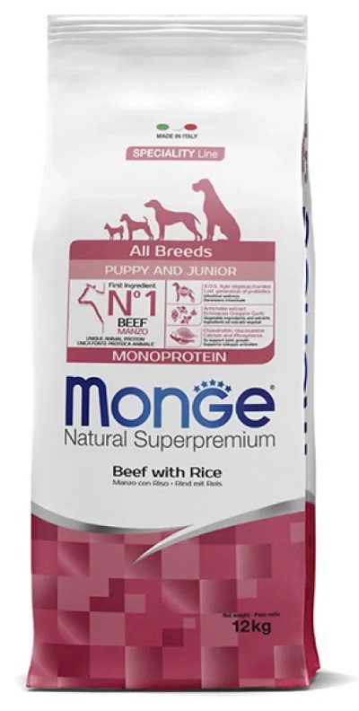 Hrană uscată pentru câini Monge Superpremium All Breeds Puppy & Junior Beef/Rice 12kg