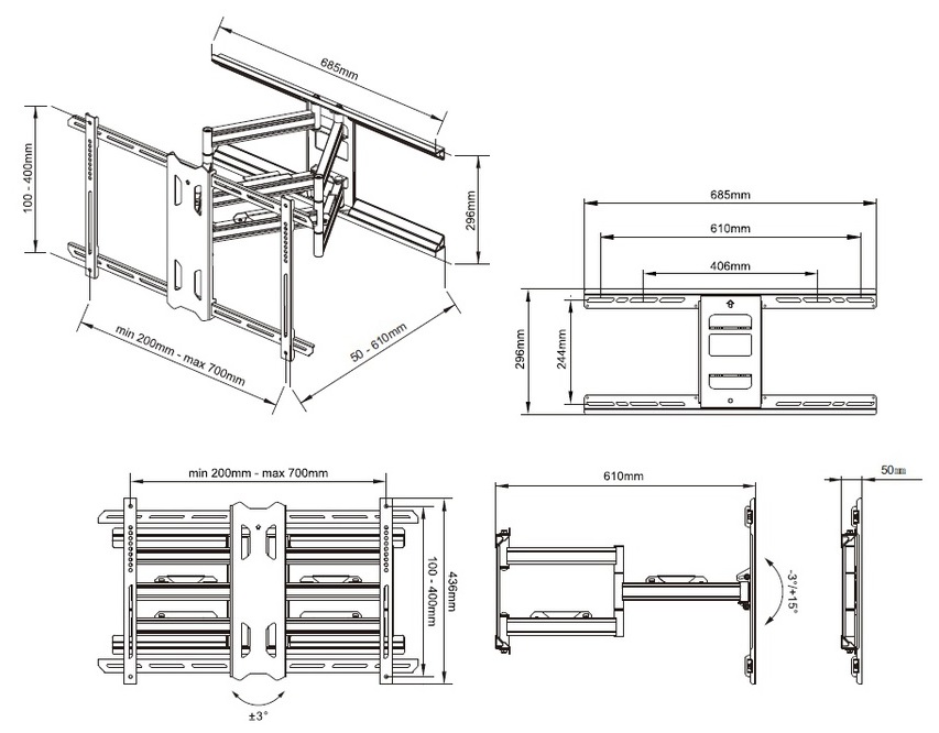 Standard VESA200x200, 300x300, 400x200, 400x400, 600x400, 700x400 mm