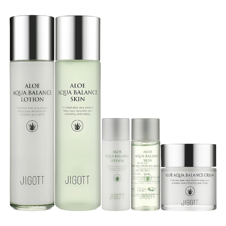 Toner Jigott Aloe Aqua Balance Skin 150 ml + Loțiune Jigott Aloe Aqua Balance Lotion 150 ml + Cremă pentru față Jigott Aloe Aqua Balance Cream 50 ml + Versiuni travel ale tonerului și loțiunii de câte 30 ml.