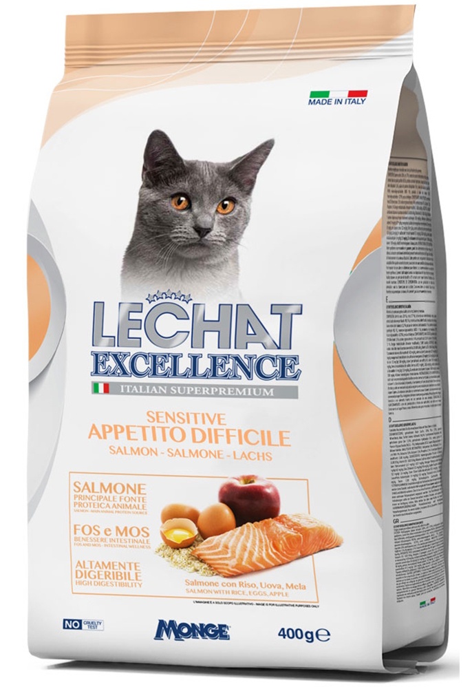 LECHAT EXCELLENCE SENSITIVE CATS SALMON este o hrană completă pentru pisici adulte pretențioase, cu orez, ouă și mere. LeChat Excellence este o linie de produse creată pentru a oferi doar ce e mai bun pisicilor tale. Hrană completă pentru animale de companie, care conține ingrediente ce garantează bunăstarea prietenilor noștri cu patru picioare în fiecare zi. Rețete cu materii prime furajere de înaltă calitate, cum ar fi ouă și somon, o sursă de proteine foarte gustoase și cu valoare biologică crescută, pentru pisici mofturoase. Bogat în pulpă de mere și prebiotice (MOS și FOS), sursă de fibre solubile pentru regularitatea fiziologică a tractului intestinal.