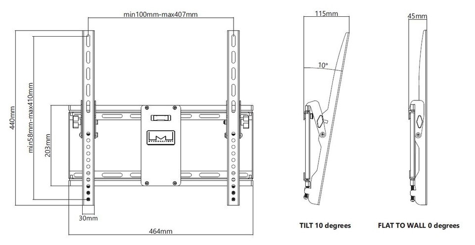 Standard VESA200x100, 200x200, 300x200, 300x300, 400x200, 400x400 mm