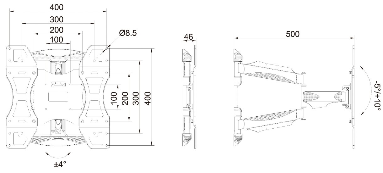 Standard VESA100x100, 200x100, 200x200, 300x300, 300x200, 400x200, 400x400 mm