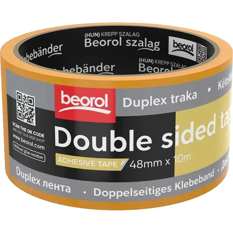 Banda dublu adeziva 48mm 10m universal Beorol - banda adeziva dublu fata, destinata fixarii sau montarii obiectelor usoare pe podea sau pe perete. Fabricata din polipropilena, are o putere de aderenta standard si nu lasa urme de lipici la indepartare.