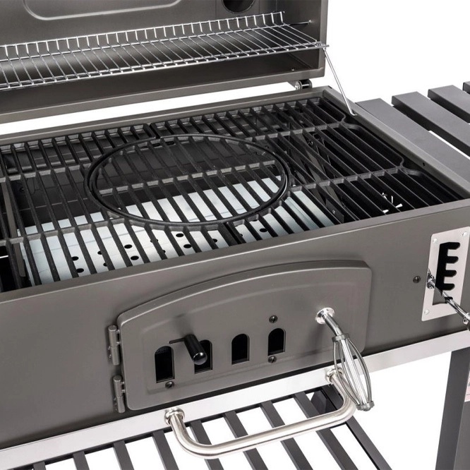 Vasul de cărbune perforat vă permite să vă pregătiți cu ușurință focul de grătar. Grătarul are un mecanism care vă permite să reglați înălțimea focarului folosind un mâner, ajutând la reglarea temperaturii alimentelor.