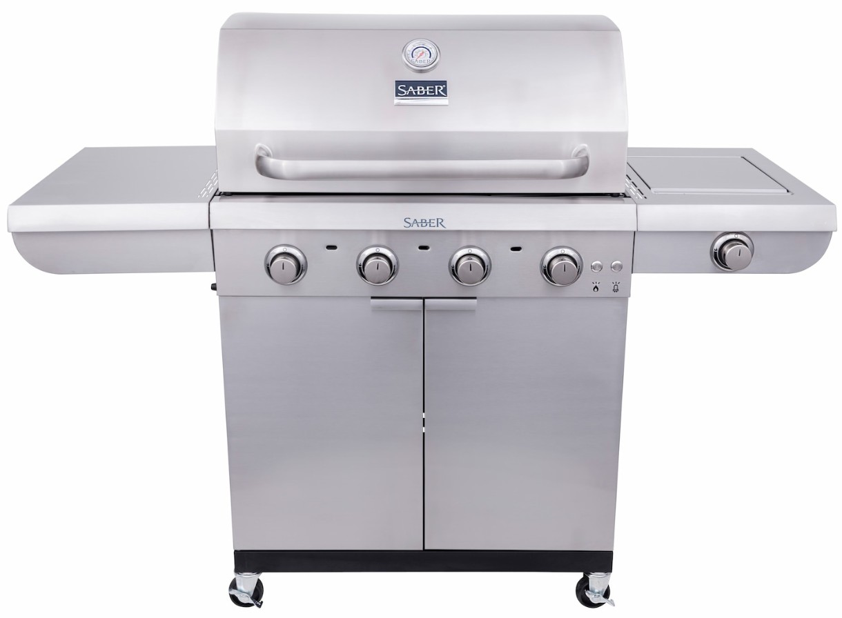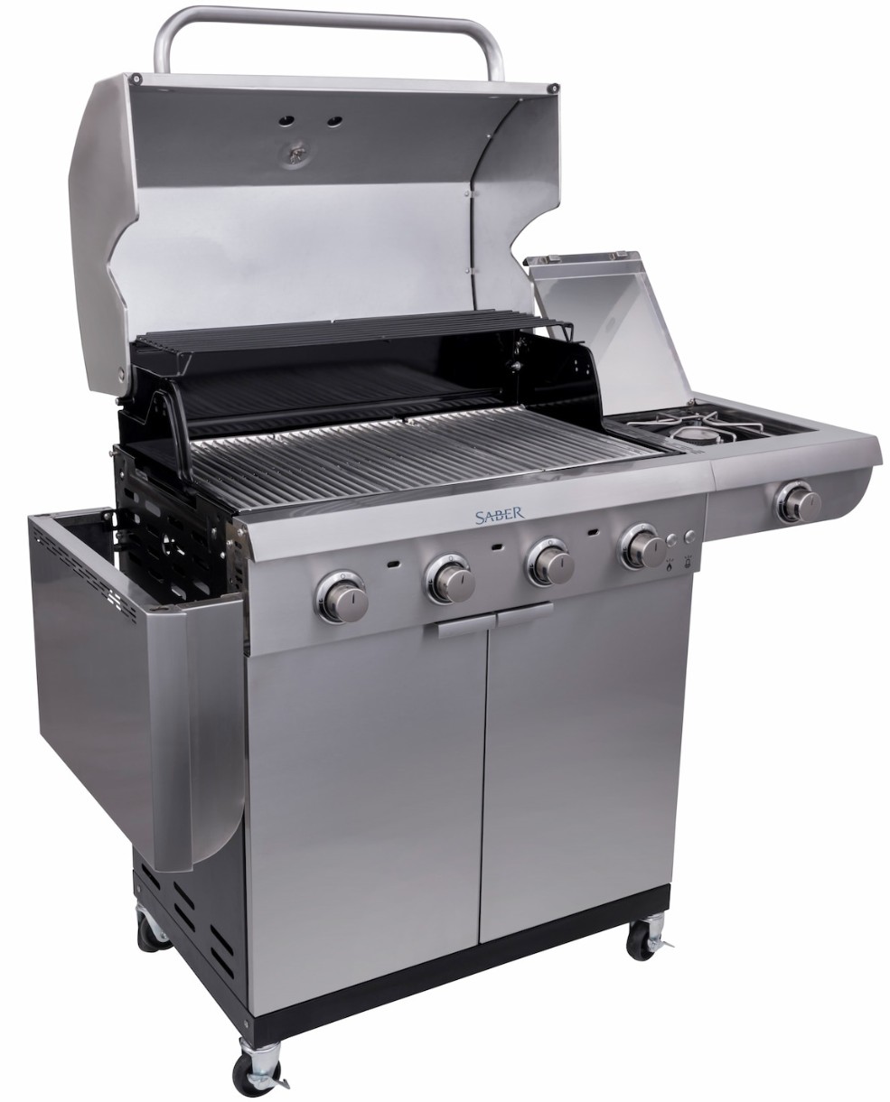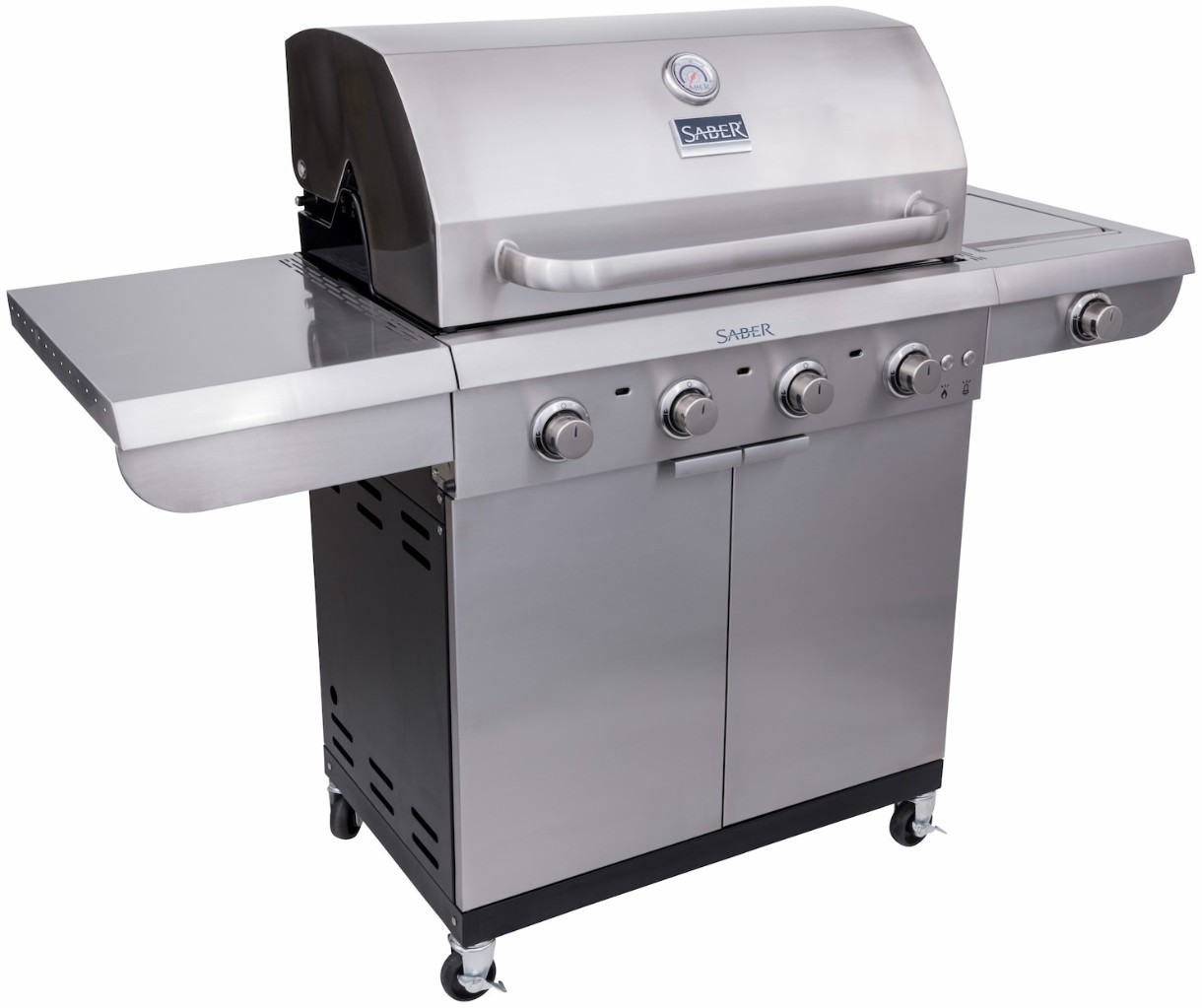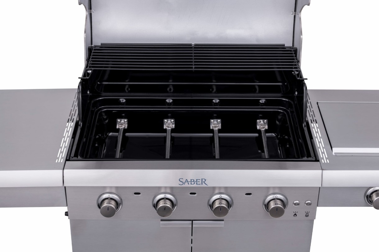 Grătarul cu gaz SABRE® Select cu 4 arzătoare oferă alimentelor dumneavoastră gustul perfect suculent. Sistemul exclusiv de gătit încălzește uniform suprafața grătarului și elimină aprinderile pentru totdeauna. Acest grătar lucios are o suprafață mare de gătit cu grătare din oțel inoxidabil de calitate restaurant și construcție premium pentru a vă oferi ani de serviciu fără probleme. Raftul lateral mare are mult spațiu pentru a depozita condimentele și ustensilele de gătit de care aveți nevoie în timpul grătarului, iar suprafața suplimentară laterală de gătit vă oferă și mai mult spațiu pentru fanteziile dvs. de bucătărie. Raftul lateral se pliază rapid, facilitând depozitarea grătarului. Select 4-Burner este echipat cu o lumină de fundal albastră, care îi conferă un stil sofisticat, iar dulapul intern are rafturi convenabile pentru depozitarea elementelor de bază pentru grătar.
