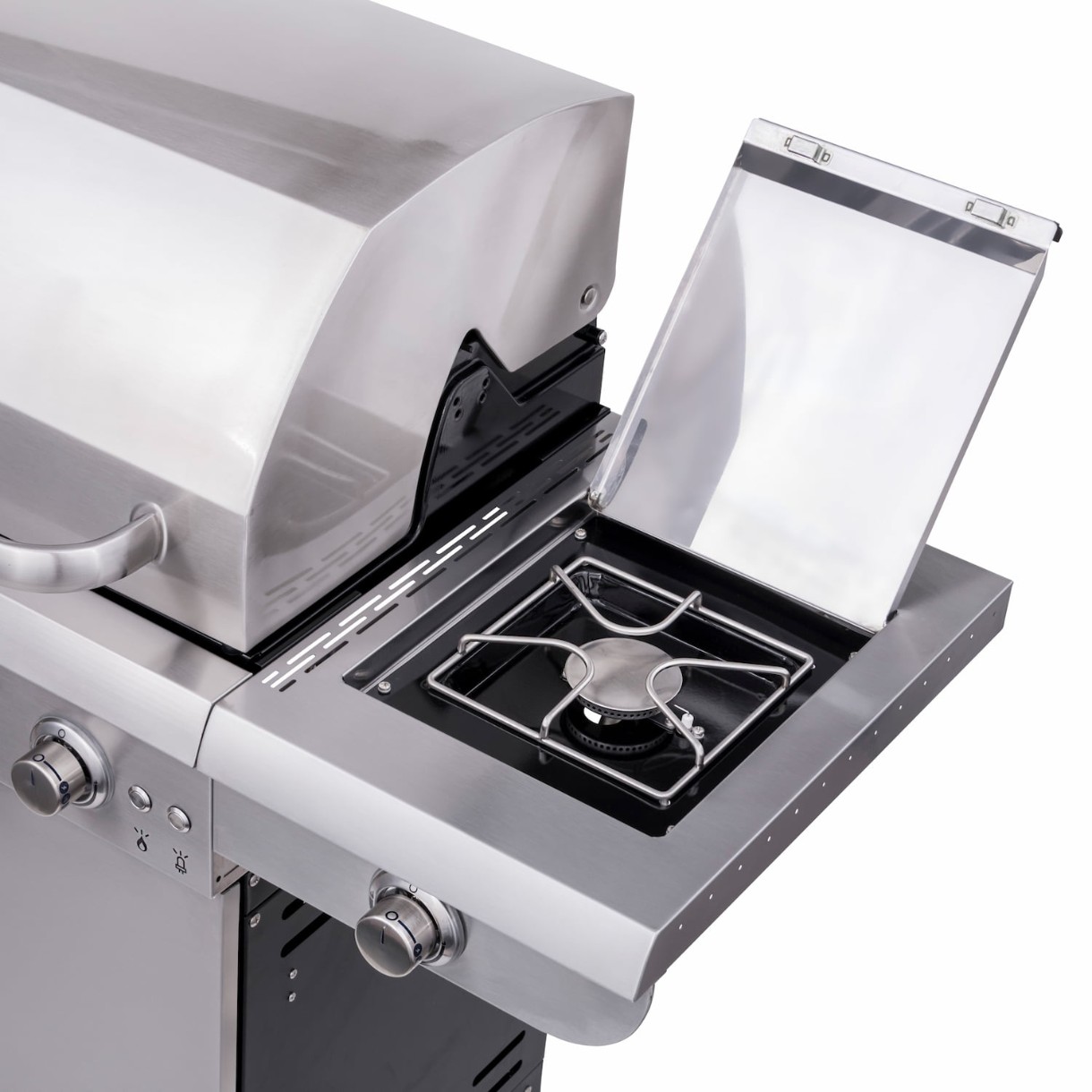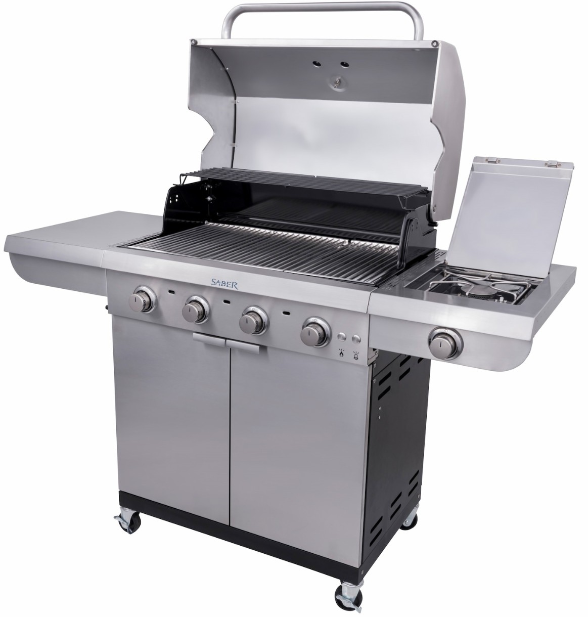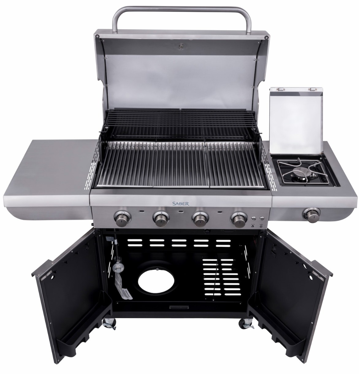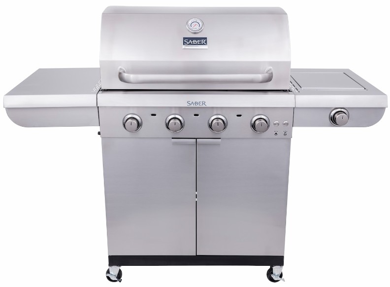 Grătarul cu gaz SABRE® Select cu 4 arzătoare oferă alimentelor dumneavoastră gustul perfect suculent. Sistemul exclusiv de gătit încălzește uniform suprafața grătarului și elimină aprinderile pentru totdeauna. Acest grătar lucios are o suprafață mare de gătit cu grătare din oțel inoxidabil de calitate restaurant și construcție premium pentru a vă oferi ani de serviciu fără probleme. Raftul lateral mare are mult spațiu pentru a depozita condimentele și ustensilele de gătit de care aveți nevoie în timpul grătarului, iar suprafața suplimentară laterală de gătit vă oferă și mai mult spațiu pentru fanteziile dvs. de bucătărie. Raftul lateral se pliază rapid, facilitând depozitarea grătarului. Select 4-Burner este echipat cu o lumină de fundal albastră, care îi conferă un stil sofisticat, iar dulapul intern are rafturi convenabile pentru depozitarea elementelor de bază pentru grătar.