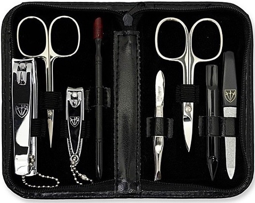 — setul include pensete, tăietoare pentru cuticule, tăietor, 2 perechi de răzuitor pe două fețe, foarfece pentru cuticule, foarfece pentru unghii și o pila de unghii;