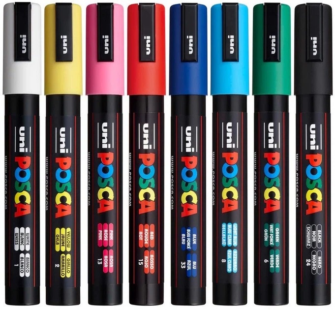 Setul de markere Uni Posca PC-5M include opt markere cu vârf rotund, cu lățimi ale liniilor cuprinse între 1,8 și 2,5 mm. Aceste markere conțin cerneală pigmentară pe bază de apă, producând culori vibrante, mate și opace, care sunt durabile în timp.
