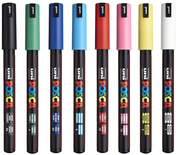 Setul de markere Uni Posca PC-1MR include 8 markere cu vârf ultrafin, ideale pentru lucrări precise și detaliate. Aceste markere conțin cerneală pigmentară pe bază de apă, producând culori vibrante, mate și opace, care rezistă în timp.