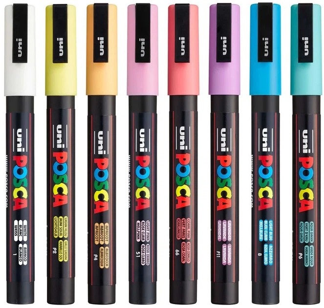 Setul de markere Uni Posca PC-3M Soft Color include opt markere cu vârf rotund, cu lățimi ale liniilor cuprinse între 0,9 și 1,3 mm. Aceste markere conțin cerneală pigmentară pe bază de apă, producând culori vibrante, mate și opace, durabile în timp.