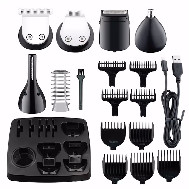 Setincarcare USB, perie de curățare, stand, duze 1-15 mm, trimmer pentru tuns precis, atașament de ras, mașină de tuns nas și urechi