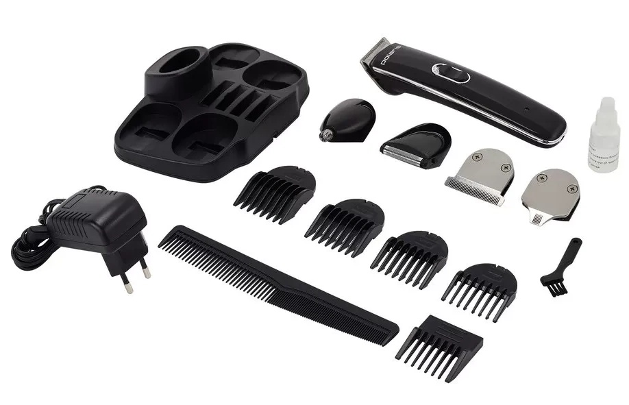 Settunder lat pentru tuns păr (3-12 mm), mașină de tuns îngustă pentru tăierea bărbii/mustații, mini aparat de ras, aparat de tuns pentru tunsori cret și detaliate, pentru îndepărtarea părului de pe nas și urechi, suport pentru depozitare și încărcare, pieptene, ulei, perie de curatat