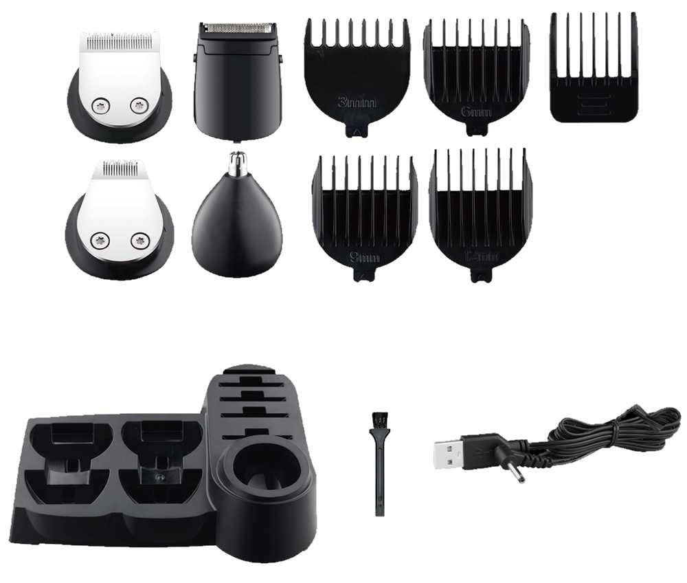 Setaparat de tuns barba, duză de precizie, cap de ras, atașament pentru tăierea părului în nas și urechi, 4 piepteni (3 mm, 6 mm, 9 mm și 12 mm), stand