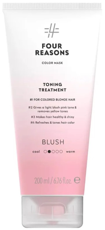 Four Reasons Color Mask Toning Treatment Blush — mască tonifiantă intensivă pentru părul blond vopsit. Pigmenții colorați oferă părului o nuanță ușoară de roz, previn apariția tonurilor galbene și mențin culoarea vibrantă. Proteinele vegetale și aminoacizii întăresc firul de păr și îi conferă o strălucire deosebită. Culoarea părului rămâne intensă, iar părul devine vizibil mai sănătos și îngrijit.