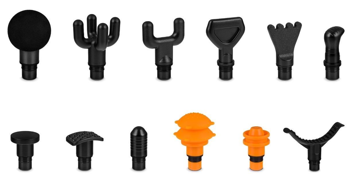 Cel mai versatil este capul degetar, folosit pentru masaj de relaxare. Cel cu patru spite va functiona atunci cand aveti nevoie sa va relaxati. In lupta impotriva umflaturilor nedorite, cel in forma de arc va face fata, in timp ce cel in forma de T se va ocupa de celulita. Capul ciuperca este conceput pentru cei mai tensionati muschi.