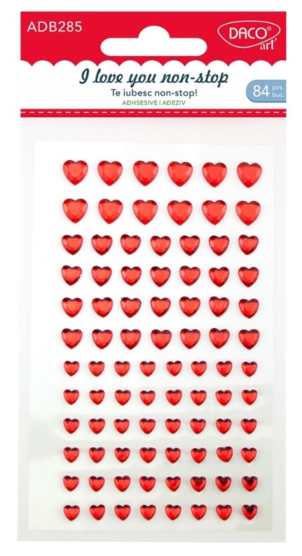 Adaugă un strop de iubire și creativitate proiectelor tale cu Te iubesc non-stop! de la DACOart! Aceste accesorii din plastic autoadeziv sunt ideale pentru a adăuga un detaliu romantic și plin de farmec oricărei creații handmade. Setul conține 84 de bucăți cu model în formă de inimă, disponibile în 3 dimensiuni diferite. Fiecare inimioară va adăuga un efect delicat și iubitor felicitărilor, colajelor, scrapbook-urilor, decorațiunilor sau altor proiecte. Datorită materialului autoadeziv, aplicarea este rapidă și simplă, fără a necesita lipici suplimentar.