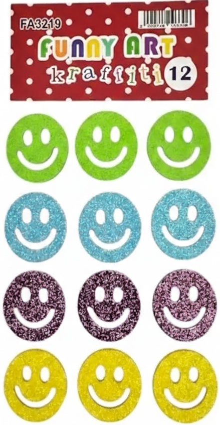 FA3219 este un set ce conține 12 figurine autoadezive sub formă de fețe zâmbitoare („smiley face”), realizate din material cu sclipici în nuanțe vesele de verde, bleu, mov și galben. Aceste decorațiuni strălucitoare adaugă un plus de optimism și culoare oricărui obiect, fiind ideale pentru personalizarea caietelor, invitațiilor de petrecere sau pentru diverse proiecte creative de lucru manual. Datorită designului iconic și texturii sclipitoare, setul transformă orice proiect simplu într-unul plin de energie pozitivă și stil, fiind apreciat atât de copii, cât și de adulți.