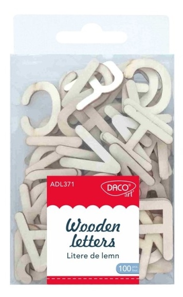 În acest produs nou DACOart, vei găsi litere din lemn pentru a-ți îndeplini și a conferi mai multă semnificație celor mai variate proiecte de craft. Se pot aplica pe accesorii pentru petrecere, decorațiuni pentru casă, materiale publicitare, planșe educative și pe orice altceva ai în gând. Le poți colora sau păstra în nuanța naturala a lemnului și le poți lipi ușor pe suprafața dorită: lemn, carton, sticlă, metal, material textil, plastic.