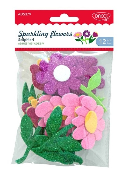 Setul de Sclipiflori conține 12 bucăți de flori de hârtie gumată glitter autoadezivă, de diferite modele, măsurând 10 cm.