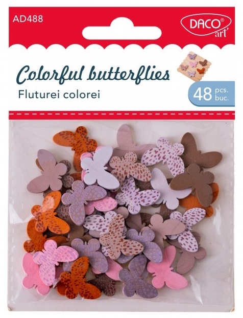 Accesoriile craft AD488 Fluturei colorei DACO sunt ideale pentru a adăuga o notă veselă și vibrantă proiectelor tale de craft. Acest set conține 48 de fluturi din lemn, fiecare cu o dimensiune de 2 cm, perfect pentru a personaliza și înfrumuseța diverse creații artistice.