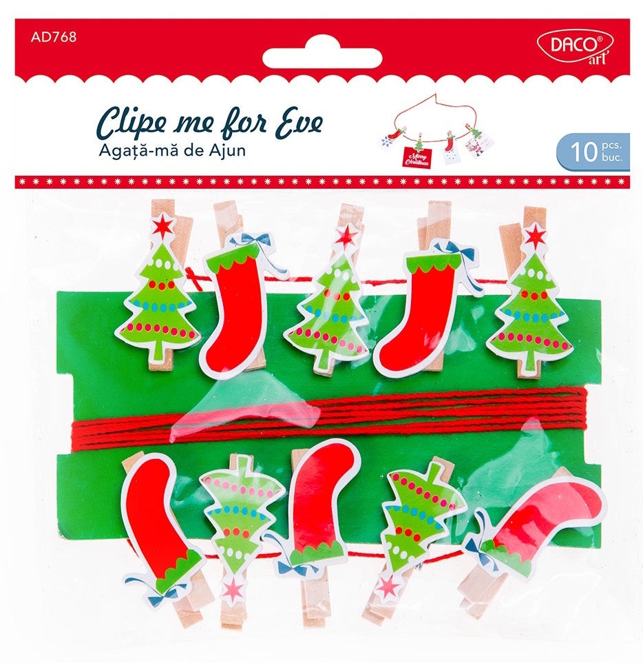 Accesoriile craft „Agață-mă de Ajun” DACOart sunt elemente decorative cu un farmec aparte, perfecte pentru a aduce atmosfera magică a Ajunului în proiectele tale creative. Acest set conține 10 clești din lemn decorați cu carton, cu modele reprezentând un brad împodobit și o cizmuliță de Crăciun și 2.5 m de sfoară roșie. Alege aceste accesorii craft pentru a adaugă un strop de tradiție și bucurie în decorurile și proiectele tale creative din sezonul rece!