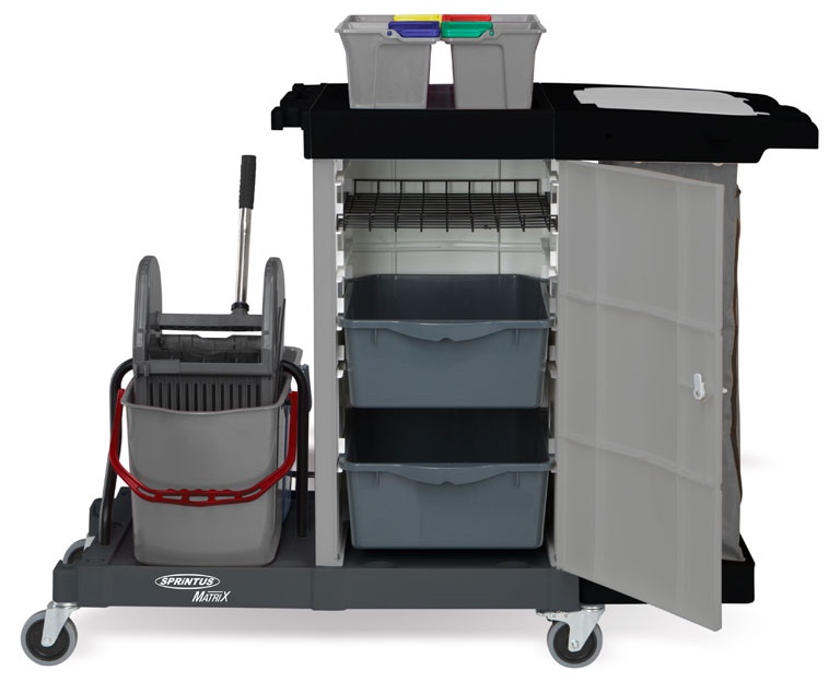 Cărucior de serviciu cu sistem de blocare complet echipat. Căruciorul Matrix service impresionează cu manopera sa perfectă, un design extrem de solid și robust, precum și un raport excelent preț-performanță. Interiorul extra-mare are două tăvi extensibile și un grilaj de stocare și oferă spațiu de depozitare versatil pentru depozitarea detergenților sau a altor ustensile. Ușa cu încuietoare asigură o siguranță maximă a obiectului și garantează un aspect modern și discret în orice moment.