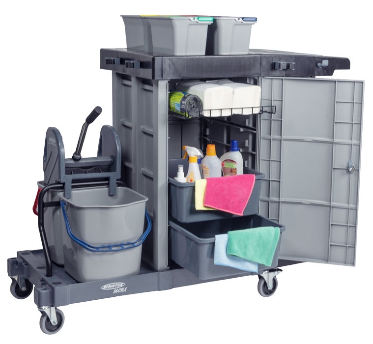 Depozitarea practică pentru planurile de curățare, rufele ușor de gol/sac de gunoi cu fermoar, precum și multe paranteze și clipuri face matricea un companion de încredere și universal aplicabile la partea ta. Cutiile de mop opționale sunt recomandate în special în zonele critice pentru sănătate, cum ar fi spitalele, azilele și practicile medicale.