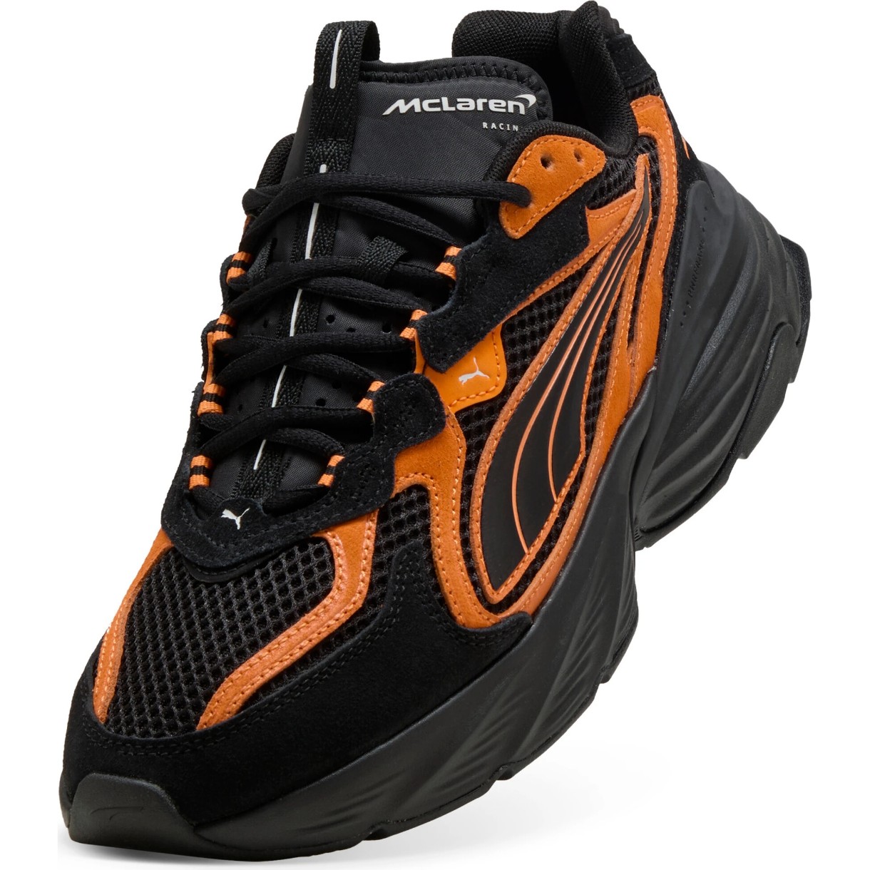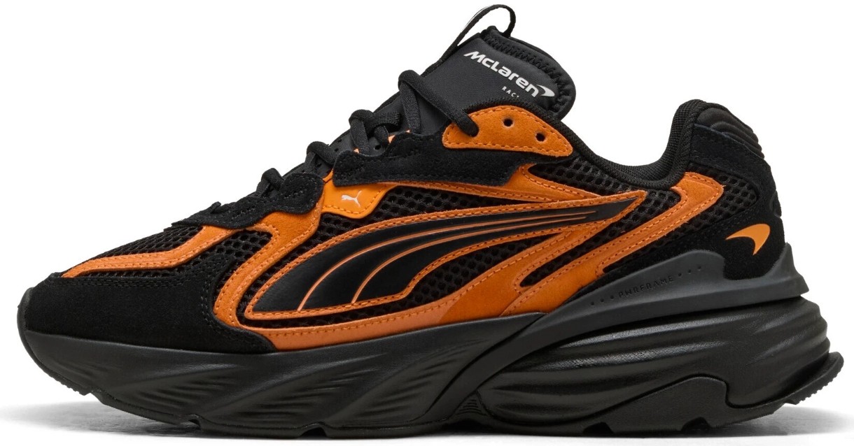 Dungile sintetice PUMA Formstrip de pe laterale, logo-ul McLaren Racing de pe limbă și elementele de branding PUMA Cat evidențiază caracterul modelului. Partea superioară este realizată parțial din materiale reciclate, combinând funcționalitatea cu o abordare mai responsabilă.