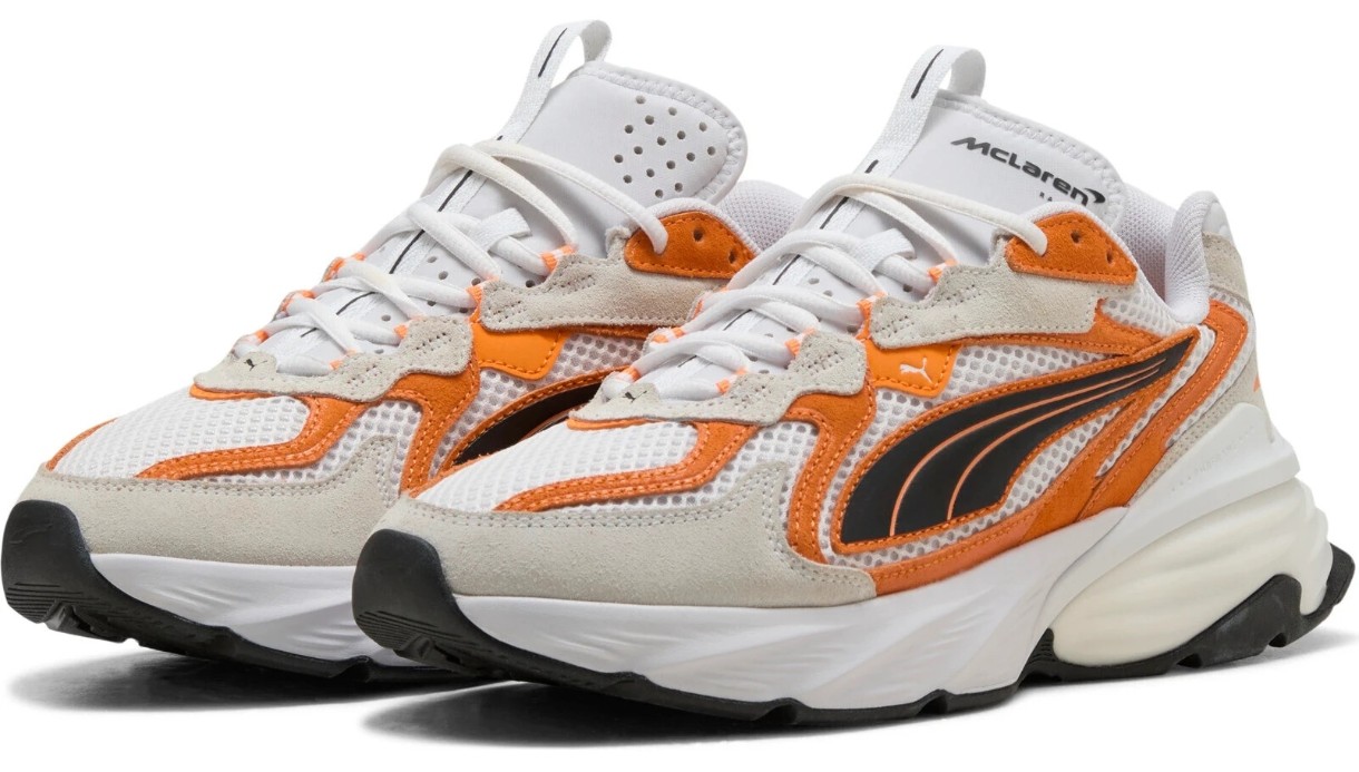 Dungile sintetice PUMA Formstrip de pe laterale, logo-ul McLaren Racing de pe limbă și elementele de branding PUMA Cat evidențiază caracterul modelului. Partea superioară este realizată parțial din materiale reciclate, combinând funcționalitatea cu o abordare mai responsabilă.