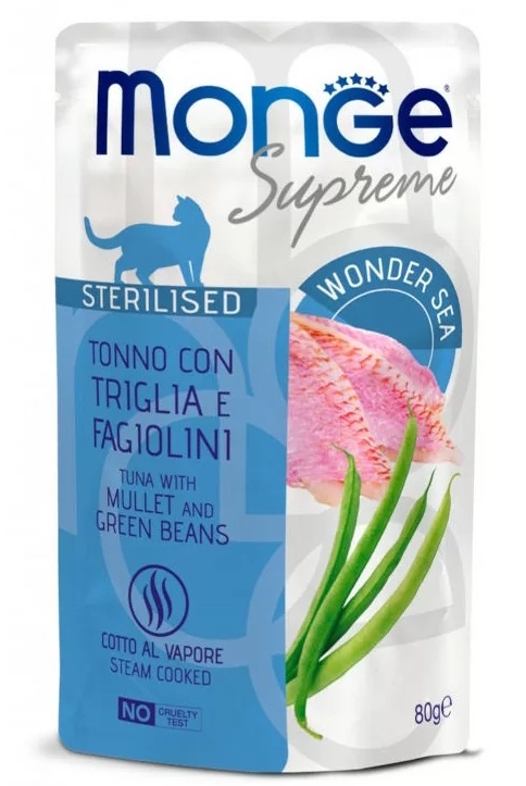 Hrană umedă pentru pisici Monge Supreme Sterilised Tuna/Mullet/Green Beans 80g