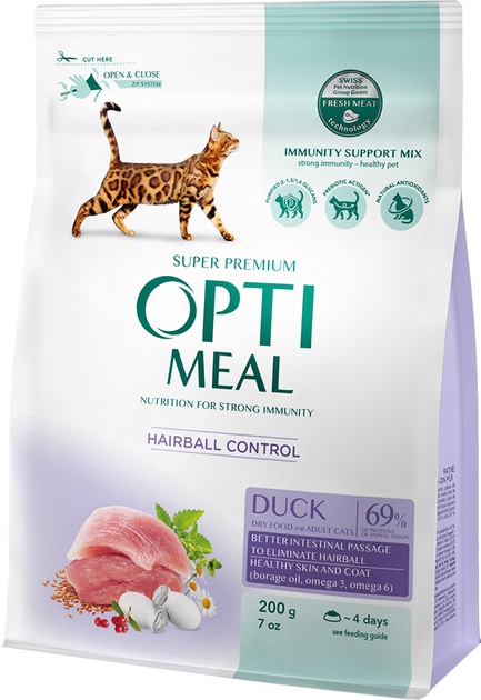 Hrană uscată pentru pisici Optimeal Adult Cat Hairball Control Duck 200g