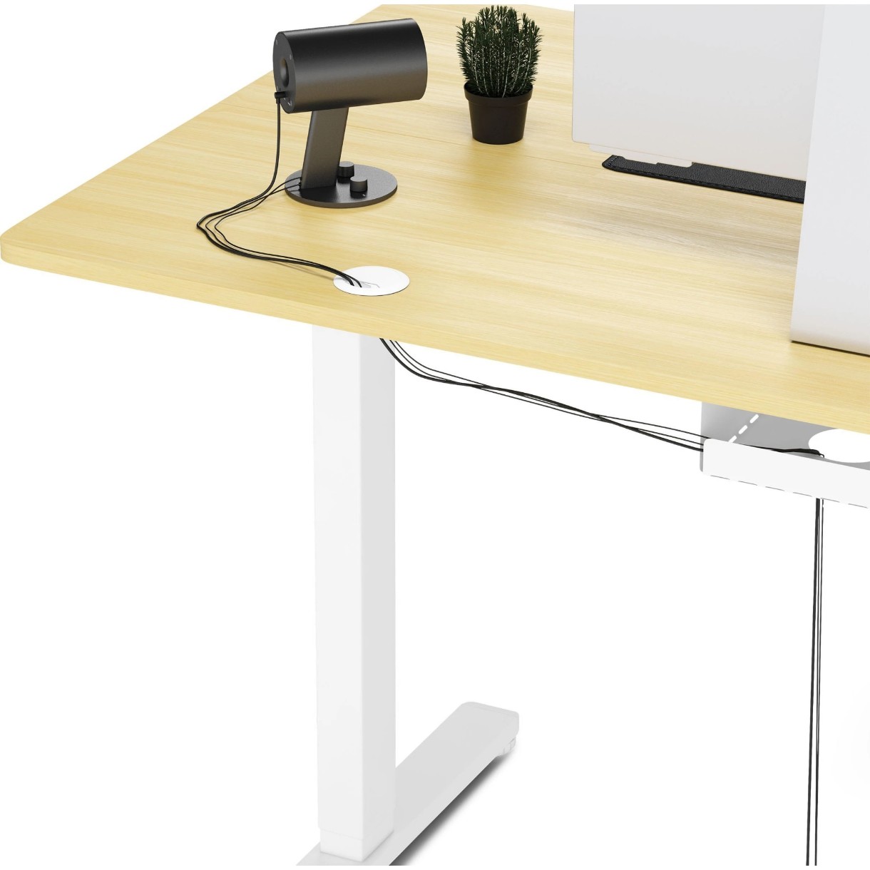 Orificiile închise și raftul pentru cabluri de sub blat permit organizarea sigură a tuturor cablurilor, menținând spațiul de lucru curat și ordonat, fără cabluri încâlcite.