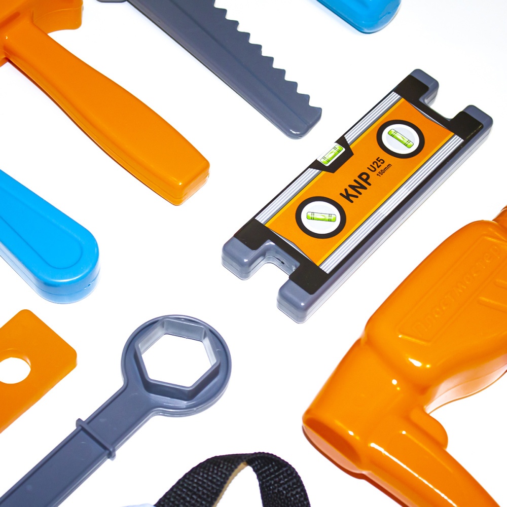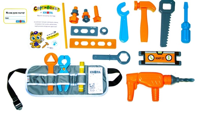 Jucăriile marca Knopa sunt fabricate din plastic de înaltă calitate, se disting prin funcționalitate, design modern, culori strălucitoare și siguranța pentru copii. Setul de scule Super Master este format din 23 de articole: o centură de scule ca un adevărat maestru, o bormașină, un certificat de cel mai bun maestru, o bară lungă/scurtă, un ciocan, o șurubelniță, un ferăstrău, un clește, o ruletă, un nivel, diverse tipuri de piulițe, șuruburi și chei, un creion și un caiet pentru notițe importante, precum și o insignă de Jack of all trades. Toate articolele sunt fabricate din plastic rezistent la impact și de înaltă calitate. Setul va ajuta la obișnuirea unui copil cu lucrul cu o unealtă de la o vârstă fragedă și va contribui la creșterea unui adevărat bărbat în el în viitor. Uneltele strălucitoare nu numai că vor încânta copilul dumneavoastră, dar vor ajuta și la dezvoltarea percepției vizuale și auditive, a abilităților motorii fine, a coordonării mișcărilor, la dezvoltarea imaginației și a fanteziei, a muncii asidue, a abilităților de măiestrie și de design. Setul va fi un cadou minunat pentru un tânăr maestru.