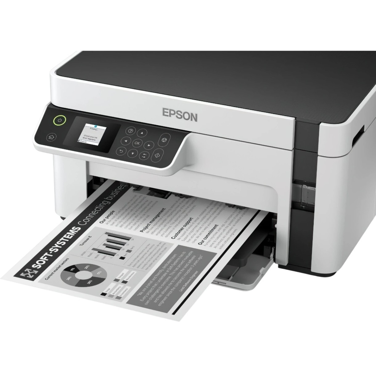 relativ compact, silențios și performant dispozitiv multifuncțional monocrom 3-in-1 cu sistem de alimentare continuă cu cerneală din fabrică și modul wireless încorporat. Producătorul îl poziționează ca un produs din categoria de preț mediu, destinat satisfacerii nevoilor birourilor mici sau de acasă. Tehnologia de imprimare cu jet de cerneală Epson Micro Piezo se bazează pe utilizarea capului piezoelectric și a cernelei pigmentate de calitate, care permit crearea de imprimări de înaltă rezoluție (până la 1440x720 dpi).