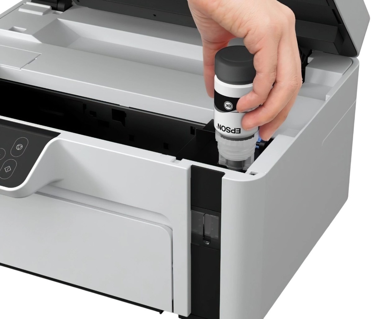Această cerneală se usucă instantaneu și nu se estompează în apă. Un nivel de performanță a imprimării decent (până la 15 pagini/min în calitate standard, până la 32 pagini/min în mod schiță) permite MFP Epson M2120 să concureze cu modelele laser, câștigând la un aspect atât de important precum costul pe pagină. Datorită modulului Wi-Fi 4 (802.11n) integrat și suportului pentru tehnologia Wi-Fi Direct, este posibilă imprimarea directă de pe smartphone-uri, tablete și laptopuri. Pentru umplerea atentă, rezervorul cu cerneală este echipat cu o supapă specială Ink Lock, care previne vărsările accidentale. Scannerul plan încorporat oferă posibilitatea de a obține copii digitale color de calitate a documentelor cu o rezoluție de până la 1200x2400 dpi.