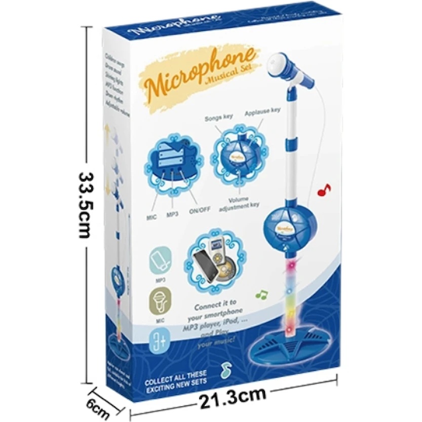 Microfonul are reglaj al volumului, 10 melodii încorporate și se oprește automat după 20 de minute de inactivitate pentru a economisi energia.