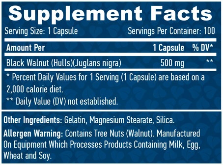 Nucă neagră (coaja) în capsule: principalele ingrediente active ale medicamentului sunt juglona și acidul elagic. Yuglon are un efect antihelmintic și antifungic pronunțat. Acidul elagic este un excelent agent antioxidant, antitumoral, antimutagenic. Pe lângă aceste substanțe, compoziția include vitaminele B, vitamina C, beta-caroten, bioflavonoide, uleiuri esențiale, taninuri, antiacide și fier. Acestea oferă efecte antiinflamatorii, antitoxice, antioxidante, imunomodulante. Dar, în primul rând, medicamentul este un agent antiparazitar eficient. Combate eficient oxiurii, viermii rotunzi și alți paraziți care trăiesc în corpul uman. Acțiunea medicamentului se bazează pe faptul că creează un mediu alcalin în organism în care paraziții nu pot supraviețui. Taninurile inhibă ciupercile de drojdie și alte microorganisme oportuniste, contribuie la eliminarea florei patogene din intestine, fără a perturba echilibrul florei intestinale benefice.