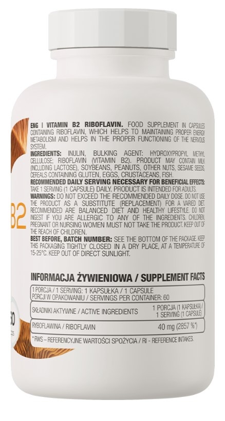 OstroVit Vitamina B2 Riboflavină este un supliment alimentar de înaltă calitate, care reprezintă o sursă de riboflavină. Produsul este disponibil sub formă de capsule ușor de înghițit și este destinat persoanelor care doresc să-și completeze dieta zilnică cu un micronutrient valoros.