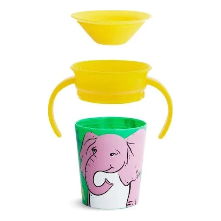 Cana Munchkin Miracle Wildlove, cu designul (180 ml), este concepută pentru a adăuga un strop de magie și distracție în timpul momentelor de învățare a bebelușului să bea independent. Această cană are o capacitate de 180 de mililitri și este proiectată să fie ușor manevrată de către mâinile mici ale bebelușului. Dispune de o supapă antiglont și anti-scursură, care previne scurgerile nedorite și permite bebelușului să bea fără a se murdări.