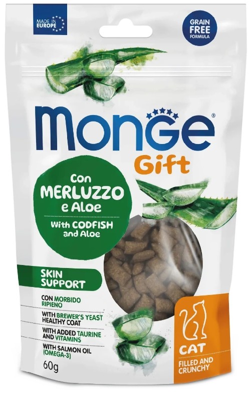 MONGE GIFT SKIN SUPPORT PIELĂ PENTRU PISICI CU COD ȘI ALOE VERA - hrănire crocantă cu cod și aloe - este un hrană complementară pentru pisicile adulte. Special concepută pentru bunăstarea pisicii dumneavoastră, datorită stratului exterior crocant pentru menținerea igienei dentare și a umpluturii moi cu aloe vera pentru piele și blană. Produsul este creat fără cereale și cu adaos de cod pentru a îmbunătăți palatabilitatea și digestibilitatea hranei. Formula este îmbogățită cu taurină pentru a menține acuitatea vizuală și funcția cardiacă normală, precum și vitamine pentru vigilență zilnică. Includerea ingredientelor funcționale precum aloe vera pentru menținerea integrității pielii și a blănii, drojdia de bere pentru a susține sistemul de apărare al organismului și uleiul de somon, o sursă de omega-3, este rezultatul cercetării „Made in Italy”. Fără adaos de conservanți artificiali și zahăr.