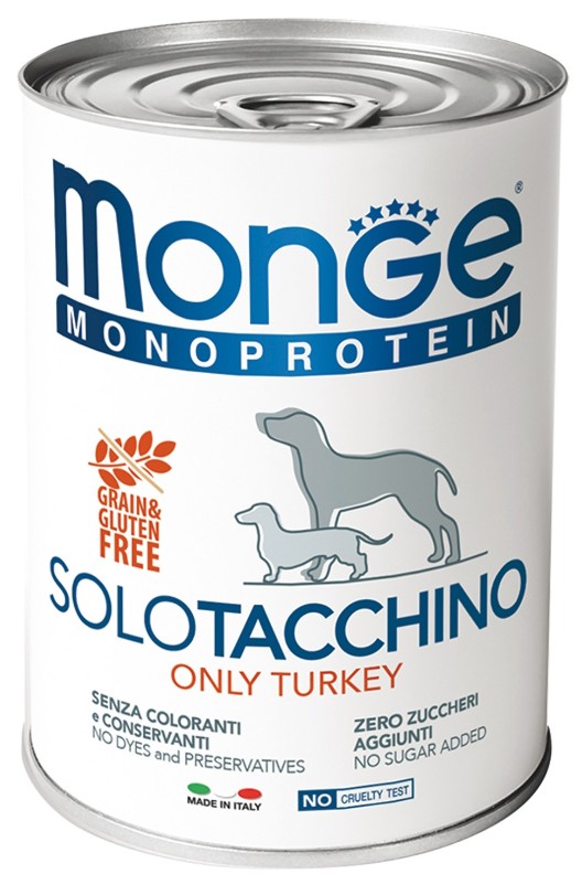 Hrană umedă pentru câini Monge Superpremium Monoprotein Paté Solo Tacchino 400g