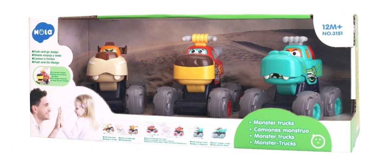 Un set de 3 camioane monstru premium de jucărie de la Hola Toys.