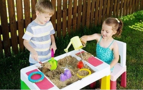 Proiectat pentru copiii care încep să deseneze, să răsfoi cărți și să construiască din blocuri. Kitul poate fi folosit atât în timpul iernii, cât și în timpul verii, în grădină. Sub capac sunt trei recipiente de adâncime de aproximativ 8 cm. Puteți stoca jucării, creioane și alte obiecte mici.