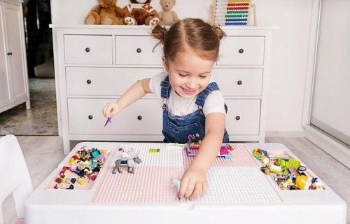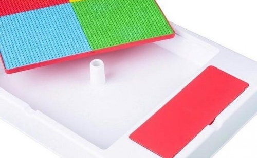 Capacul tabelului este bidirecțional: pe de o parte, neted - pentru desen și scris; pe de altă parte, pentru a juca cu blocuri, compatibile cu seturi de zaruri de la producătorii populare (nu sunt incluse).