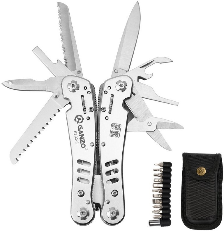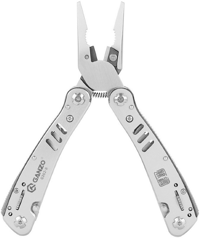 Ganzo G302-H este un instrument multifuncțional bazat pe cunoscutul model al mărcii Ganzo. Cu toate acestea, modificările au afectat nu numai prelucrarea metalelor, ci și aspectul unor unelte. Drept urmare, cumpărătorii au primit un alt exemplu excelent de instrument practic, ale cărui beneficii fiecare proprietar le poate aprecia în practică. Toate uneltele, precum corpul sculei multifuncționale Ganzo G302-H, sunt fabricate din oțel 440C. Acesta este un aliaj de înaltă calitate, care aparține categoriei de oțel inoxidabil. Poate fi folosit în condiții de contact frecvent cu apa, care sunt tipice pentru drumeții, excursii de pescuit și excursii de vânătoare. Îngrijirea minimă a instrumentului va asigura durabilitatea acestuia și păstrarea calităților externe. Instrumentul principal al instrumentului multifuncțional conform principiului locației este cleștele. Ele sunt, de asemenea, înzestrate cu funcția de tăietor de sârmă și capacitatea de a prinde ferm piulițe, bucșe și alte obiecte rotunde. Uneltele rămase sunt distribuite între cele două mânere ale instrumentului multifuncțional și plasate în interiorul acestora. Acestea sunt două cuțite (obișnuite și zimțate), un ferăstrău, deschizători de conserve și deschizători de sticle, foarfece, o punte, o șurubelniță mică, un suport magnetic pentru biți interschimbabile, un instrument pentru îndepărtarea izolației de pe fire. Alături de instrumentul multiplu, se vinde și un set de șurubelnițe necesare pentru lucrul cu diverse șuruburi și șuruburi. Sunt plasate într-un singur organizator comun. Acest organizator și unealta multiplă pot fi depozitate într-o singură carcasă de nailon.