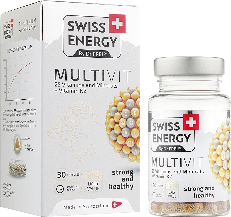 Complexul de vitamine și minerale contribuie la îmbunătățirea metabolismului, precum și la funcționarea sănătoasă a sistemului imunitar. Vitamina K2 este necesară pentru structura normală a țesutului osos și, de asemenea, previne bolile cardiovasculare. Recomandat pentru hipovitaminoză și lipsa de minerale, precum și pentru activitate fizică intensă.