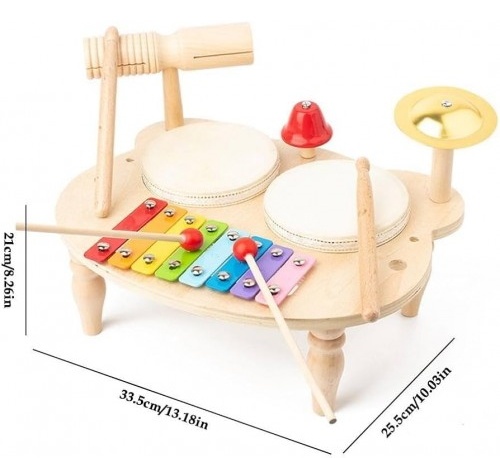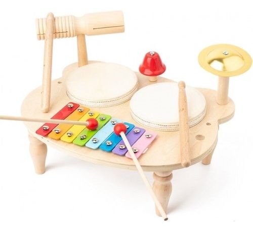 Setul include: xilofon, tobe, ciocănel, clopoțel, și tamburină.