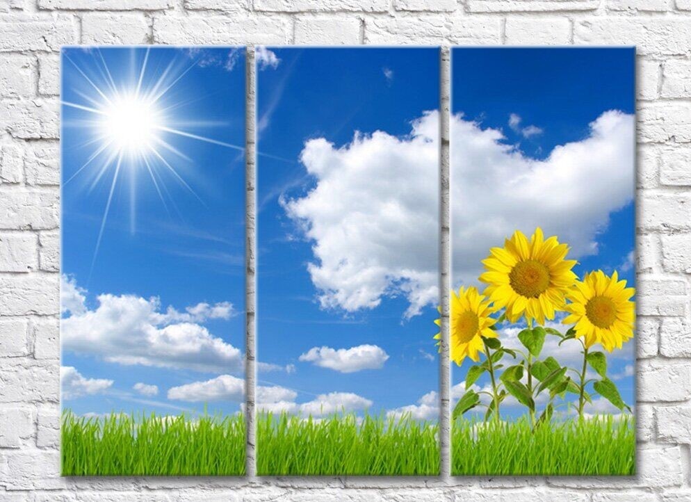 Pictură Gallerix Sunflower flowers on green grass against a cloudy sky (500771)